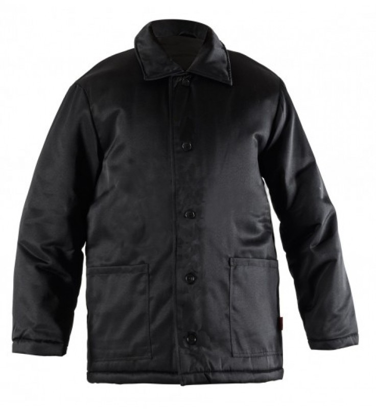 Куртка (телогрейка) утепленная с центральной бортовой застежкой на пуговицы. Однотонного черного цвета. Спереди и в спинке дополнительный утеплитель.